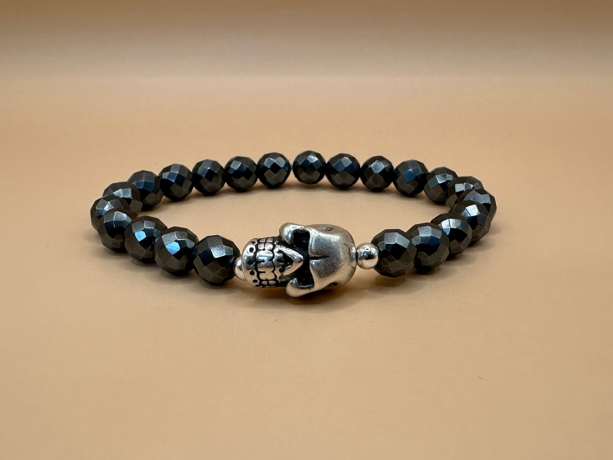 ARMBAND HÄMATIT FACETTIERT MIT 925 SILBER TOTENKOPF (8mm)