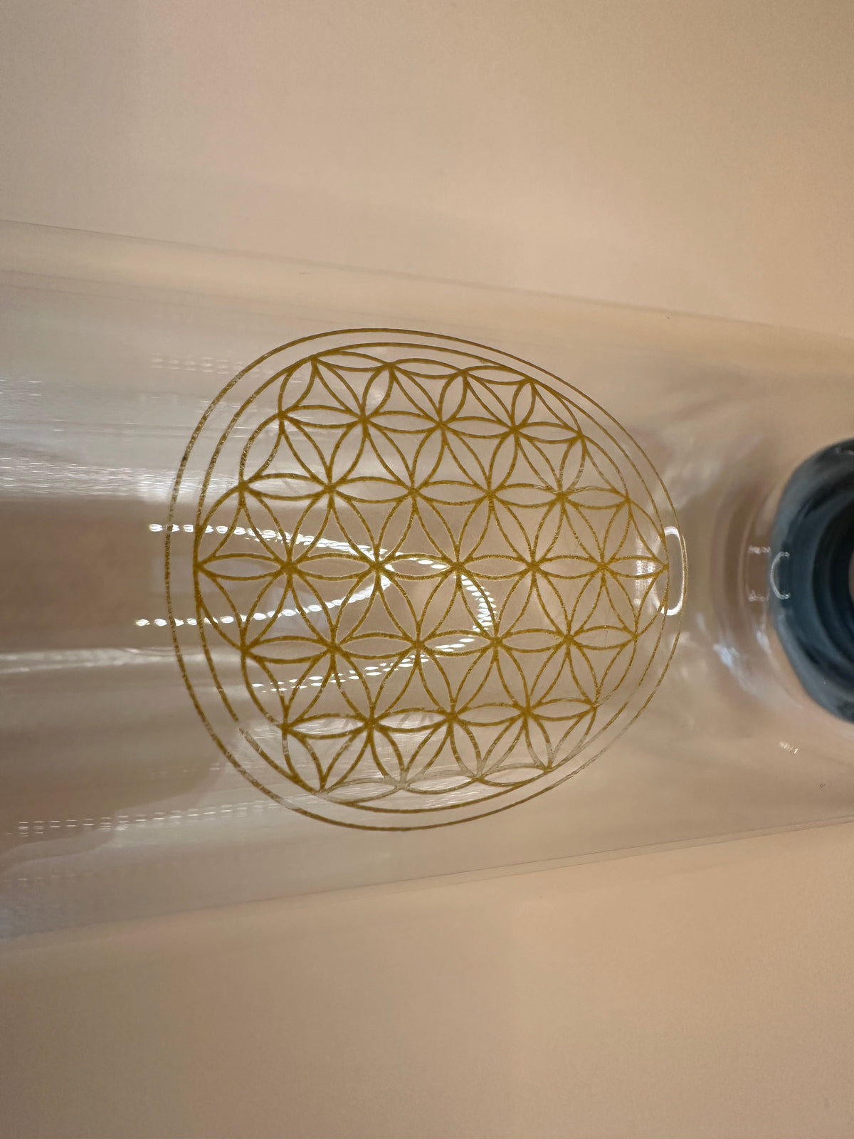 Trinkflasche aus Glas mit Blume des Lebens Aufdruck und Heilsteinen.